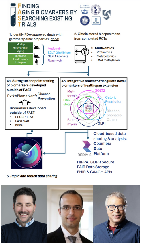 Aging is the leading cause of most chronic diseases driving population burden of disability and premature mortality. The decline our bodies experience as we grow older is accepted as normal. It shouldn’t be. We can see around us the examples of successful aging; people live through their 80s and 90s cognitively intact and in good health. Breakthroughs in geroscience establish the biology of aging can be modified; interventions in laboratory animals that slow biological processes of aging increase healthspan. These preclinical discoveries suggest that, for humans, maintaining health and function into the 9th decade of life and beyond is possible for all of us. FAST is motivated by the long-term goal of enabling more people to realize this potential for healthspan extension. To achieve this goal, we aim to move biomedical research away from geriatrics-clinic whack-a-mole, in which we develop treatments for symptomatic diseases one at a time, and toward therapies that maintain health and prevent disease. Preclinical studies are bringing these therapies within reach. But translating them in human trials faces the challenge that, unlike in short-lived laboratory models, determining impacts on human healthspan will require decades of follow-up. To overcome this challenge, biomarkers are needed that are responsive to intervention over timescales of months-to-years and which can provide surrogates for the long-term impacts of novel therapies on healthspan. The immediate objective of FAST-PROSPR is to establish sensitive and specific biomarkers that can be tested to determine whether an intervention is slowing the biology of aging and extending healthspan.